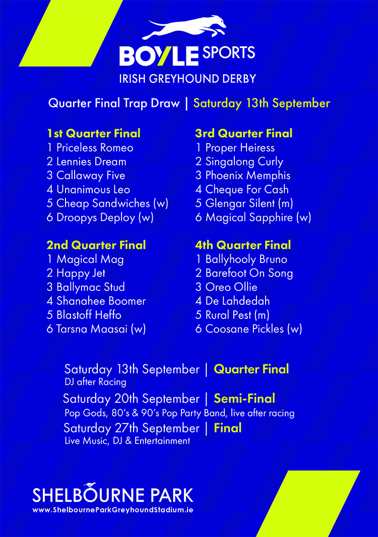 Below is the full schedule of this year’s blue riband leading up to the greatest occasion in world greyhound racing, final night on Saturday, September 27th.