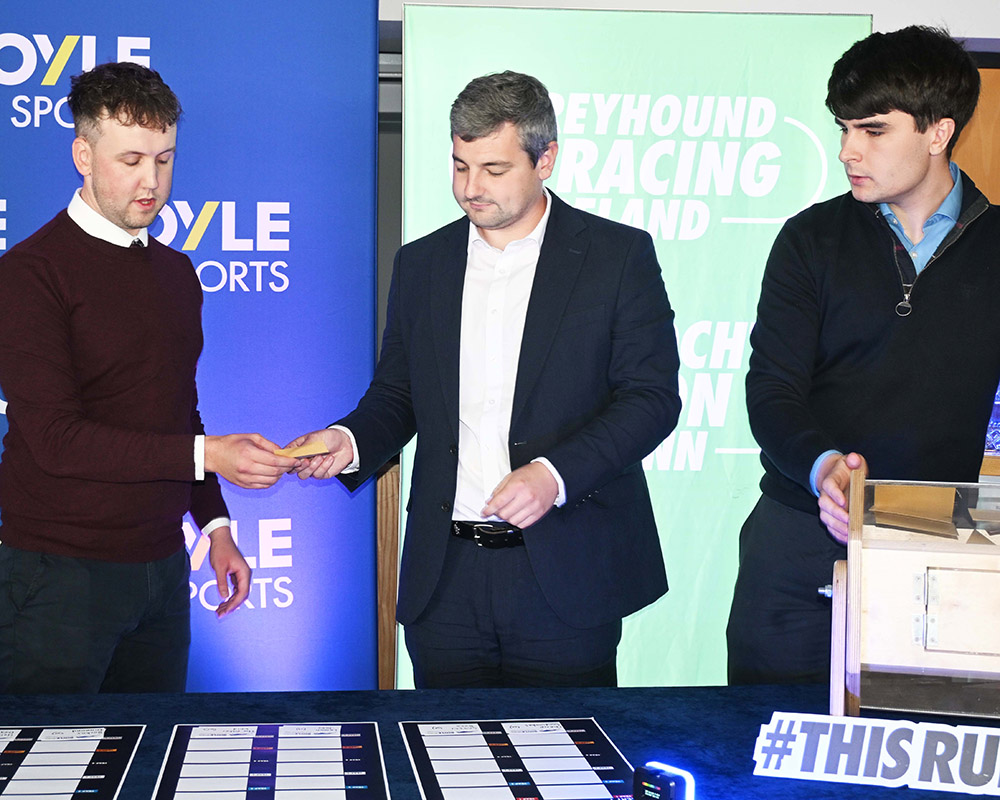 Making the Draw for the 2025 BOYLESports Derby (L To R ) are Dylan Brennan Racing manager Shelbourne Park, Brian O'Keeffe Senior Media Relations Manager BOYLESports (Sponsors) and Conor Matthews Racing Manager Shelbourne Park. Pic: Imelda Grauer