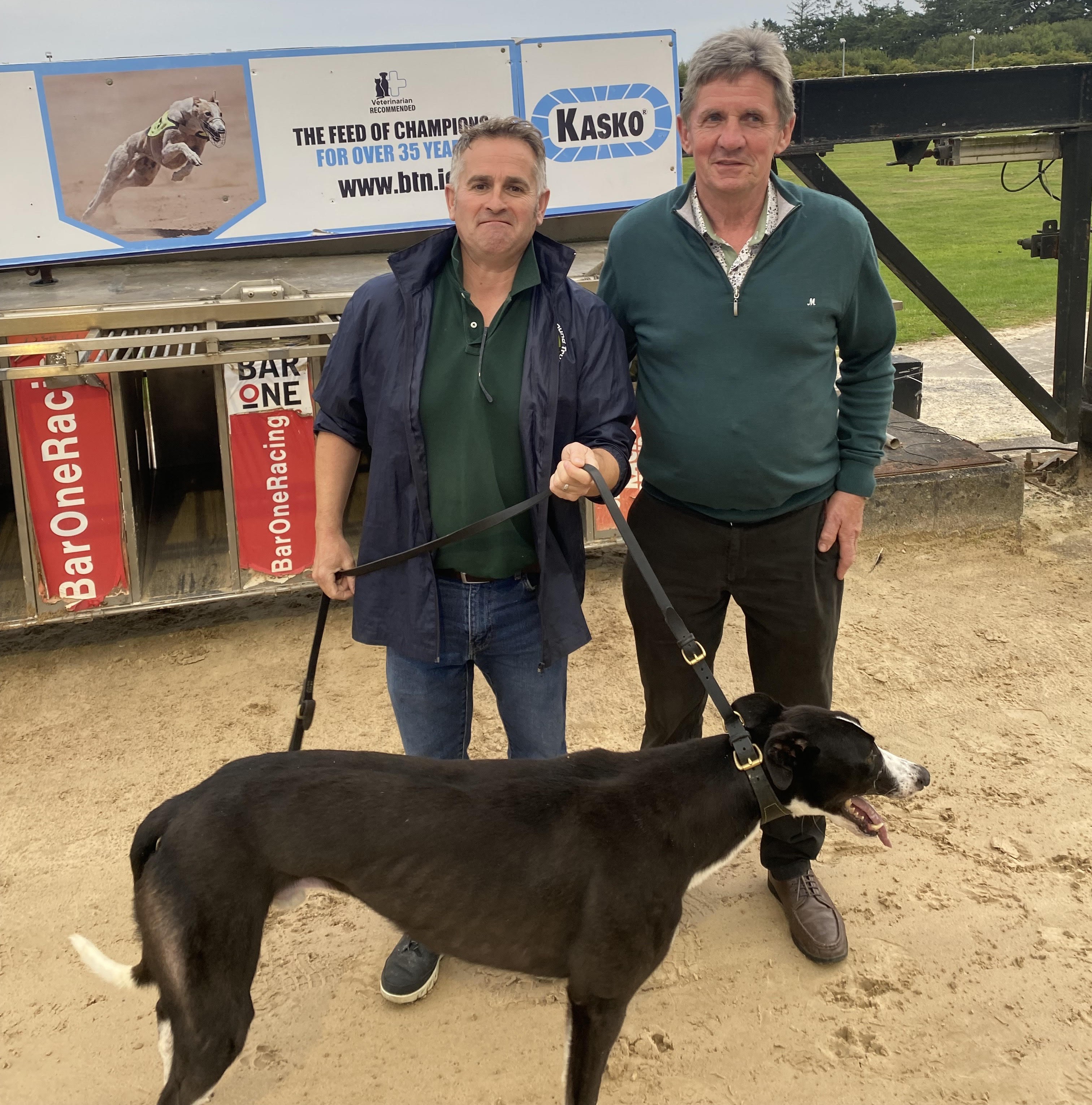 The well-backed even money favourite (Pic right with) John Linehan and Mossie O’Leary after Droopys Sort clocked a top class 28:07 in the opening round of the A1 Kasko Derby. displayed plenty of early dash to slip around in front and in truth, the September puppy was always in control up front. Clocking a top class 15.97 down into the third corner, the impressive winner then stayed on strongly to beat Priceless Romeo, by four and a half lengths, in 28.07.