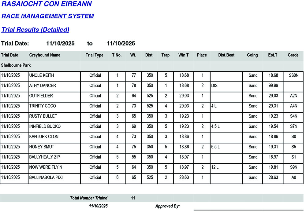 Shelbourne Park Trial Results Saturday 11/10/2025: