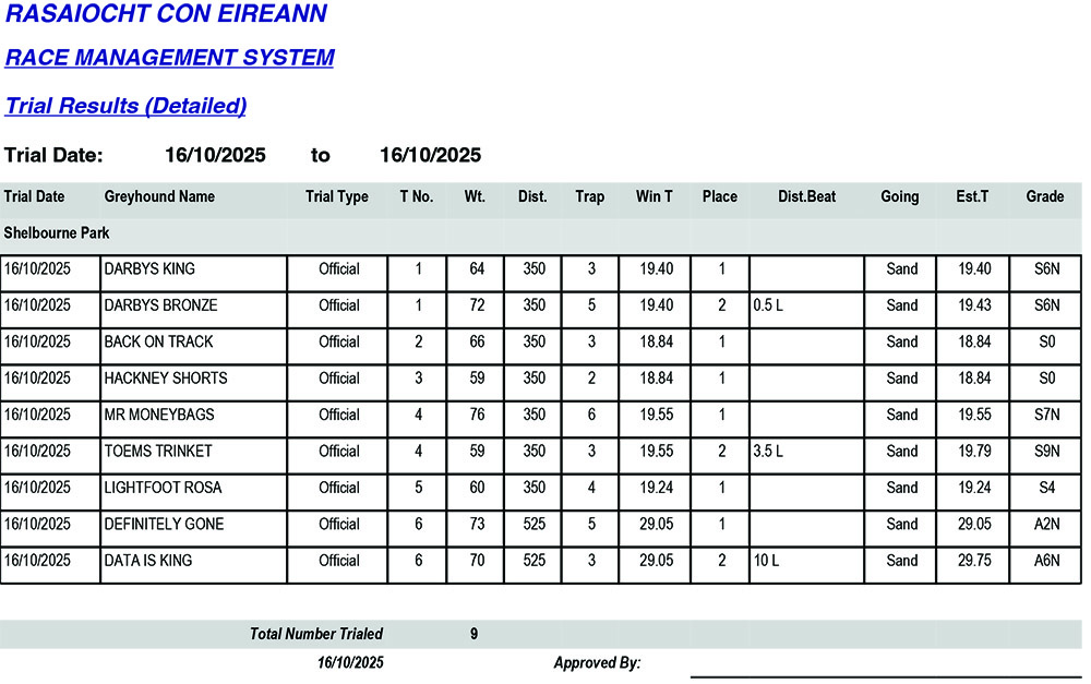 Shelbourne Park Trial Results Thursday 16/10/2025: