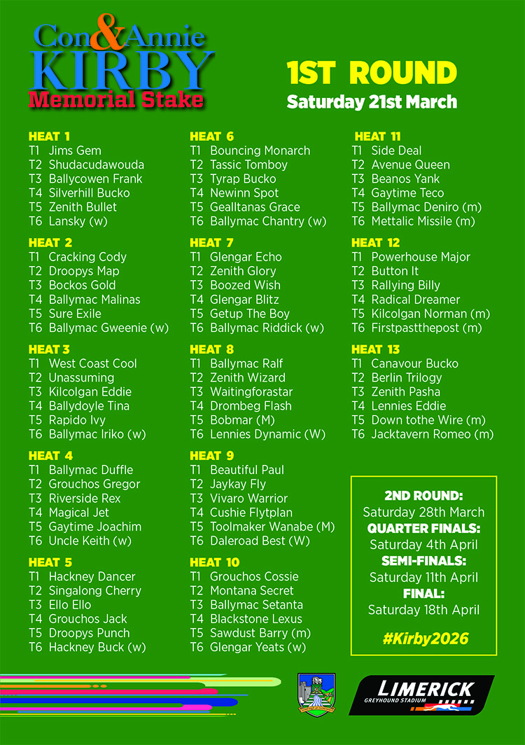 The draw for the first round of the 2026 Con & Annie Kirby Memorial 525 took place at Limerick Greyhound Stadium earlier today and, by all accounts, it looks one of the strongest on record.