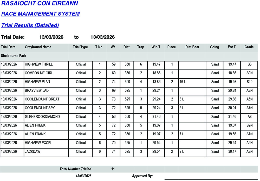• SHELBOURNE PARK TRIAL RESULTS FRIDAY 13/3/2026
