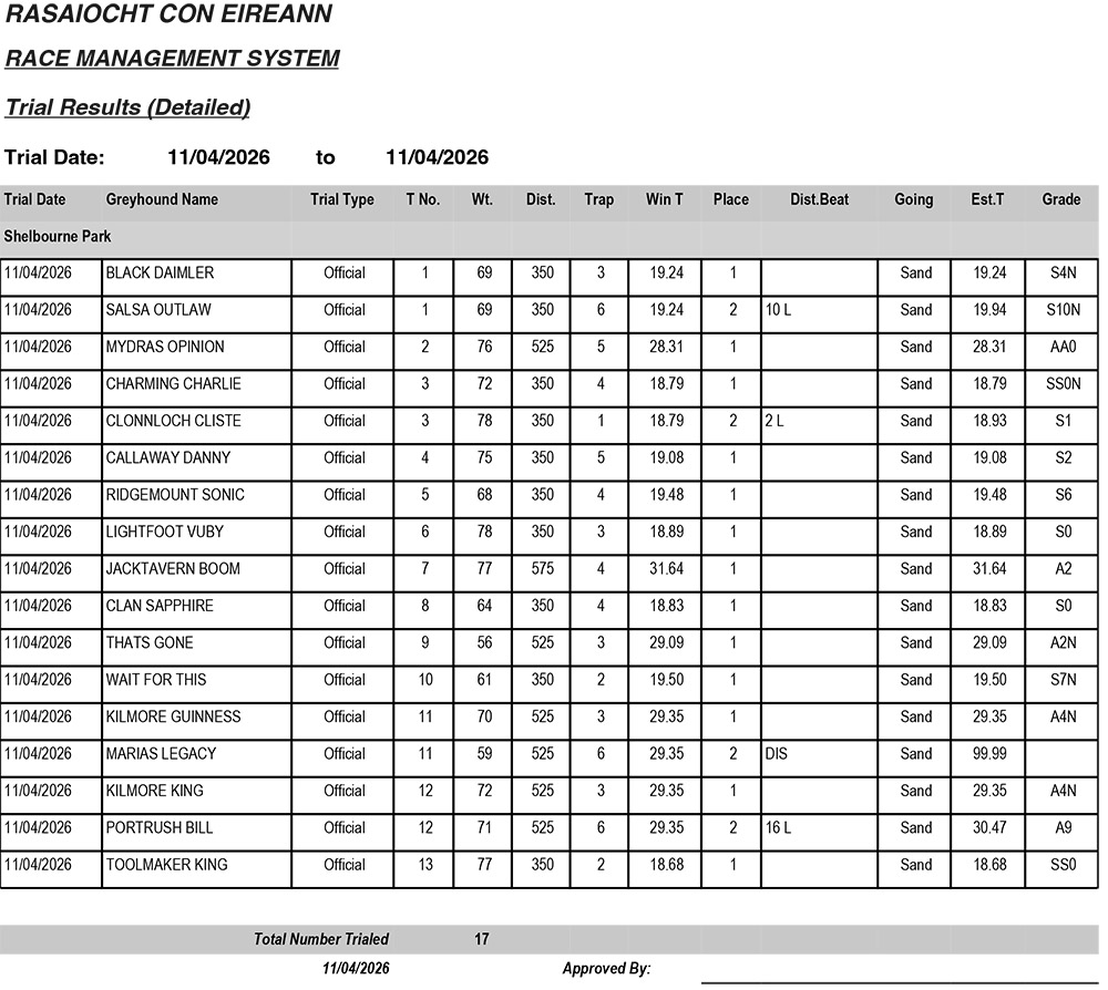 Shelbourne Park Trial Results Saturday 11/4/2026: