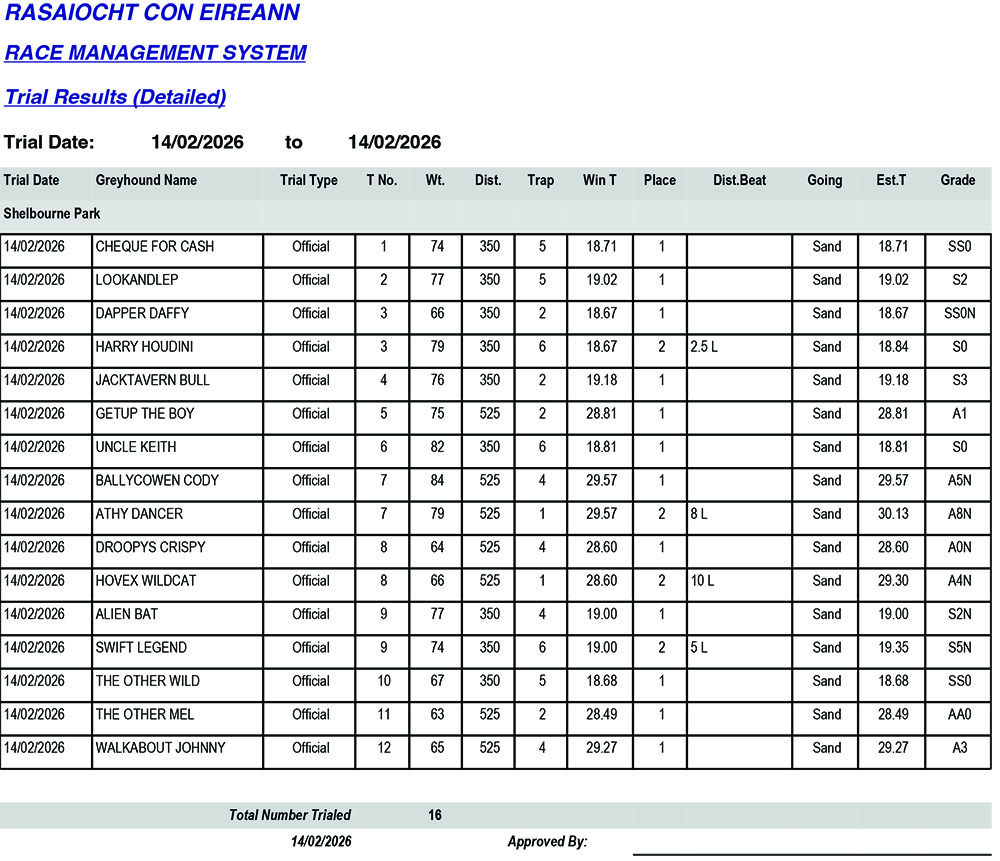 Shelbourne Park Trial Results Saturday 14/2/2026: