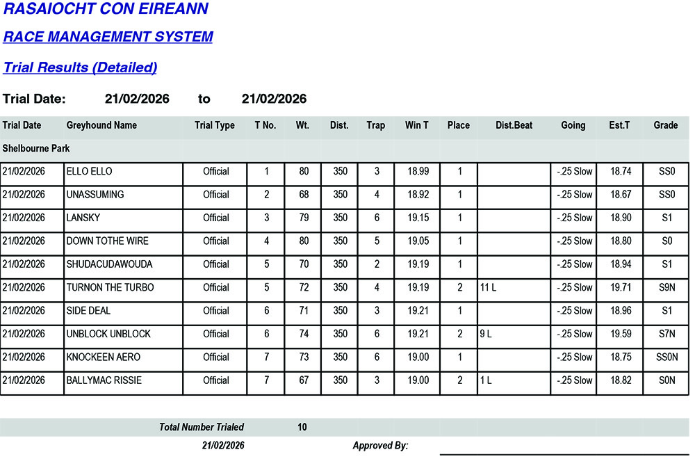 Shelbourne Park Trial Results Saturday 21/2/2026: