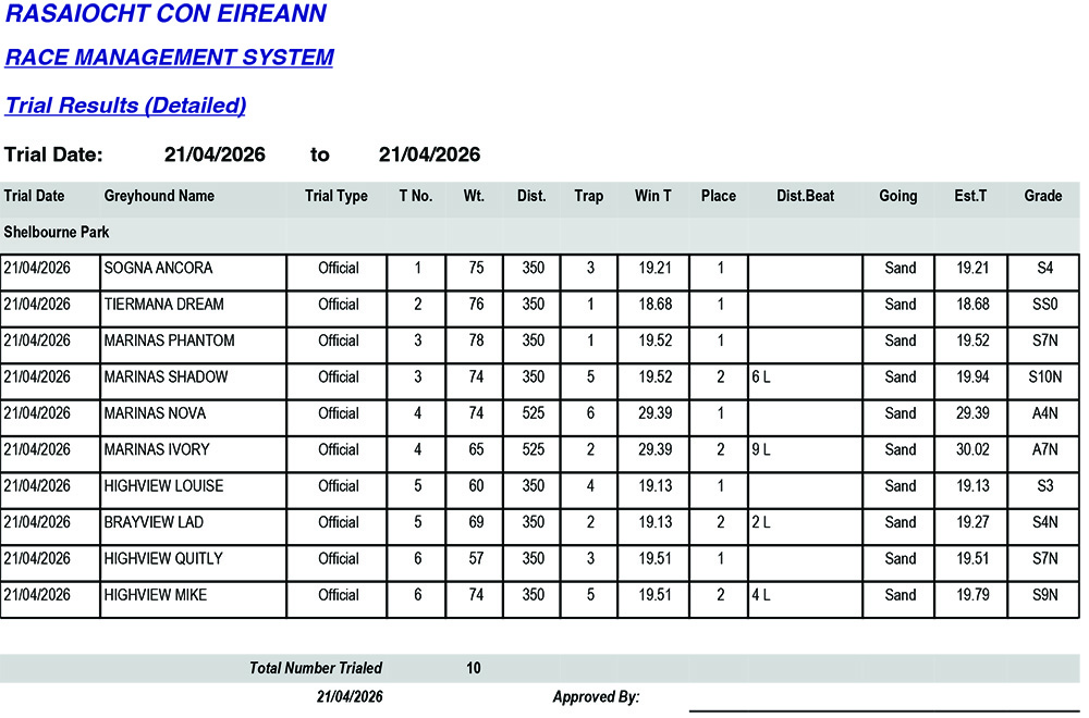 Shelbourne Park Trial Results Tuesday 21/4/2026: