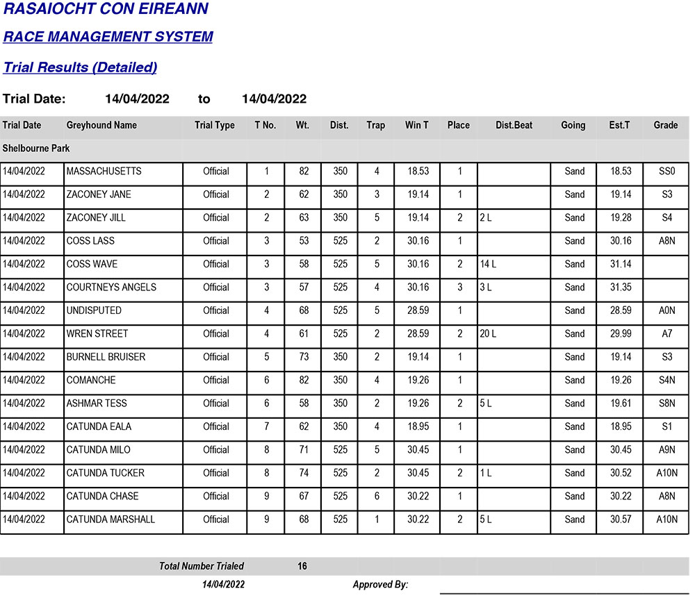SHELBOURNE PARK TRIAL RESULTS, THURSDAY 14/04/2022