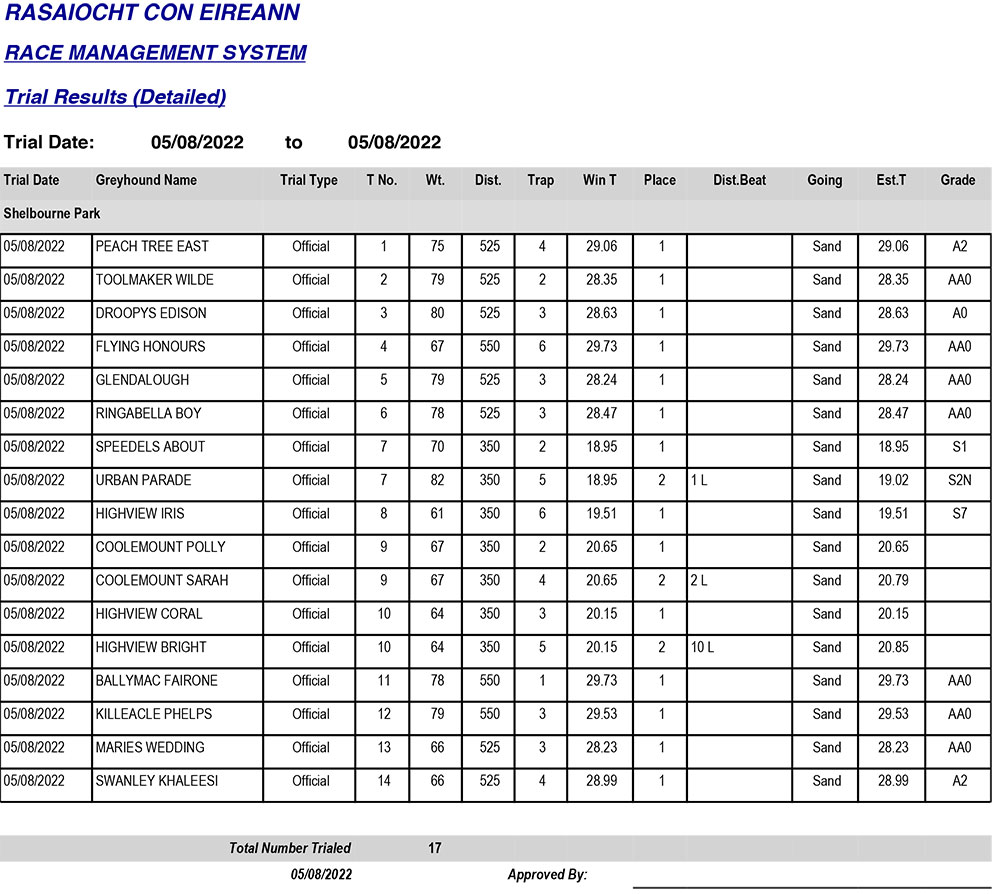 Shelbourne Park Trial Results, Friday 5/08/2022: