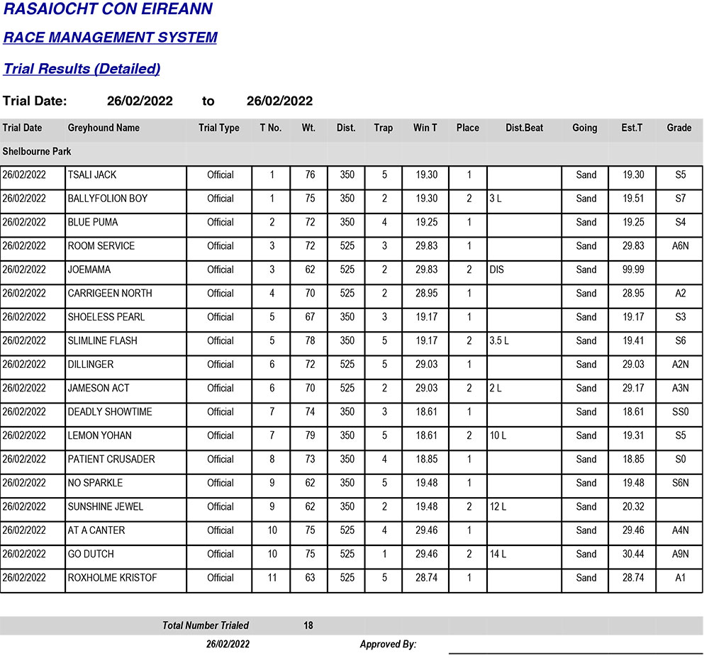 Shelbourne Park Trial Results, Saturday 26/02/2022: