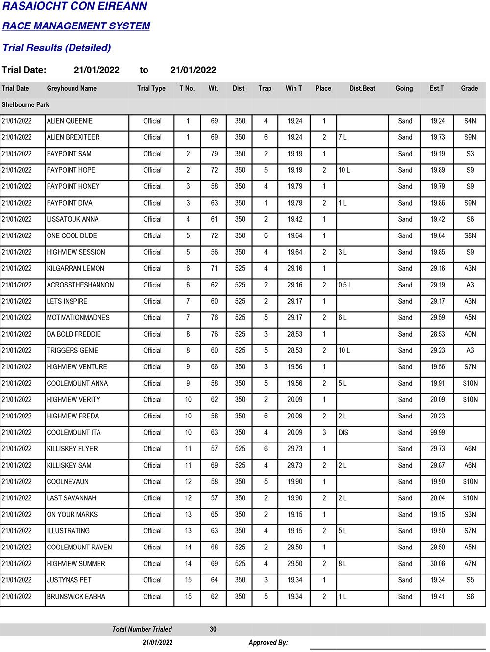 Shelbourne Park Trial Results, Friday 21/01/2022: