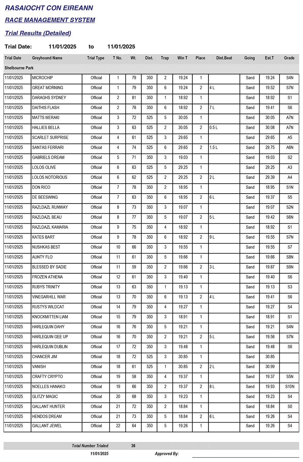 Shelbourne Park Trial Results, Saturday 11/1/2025: