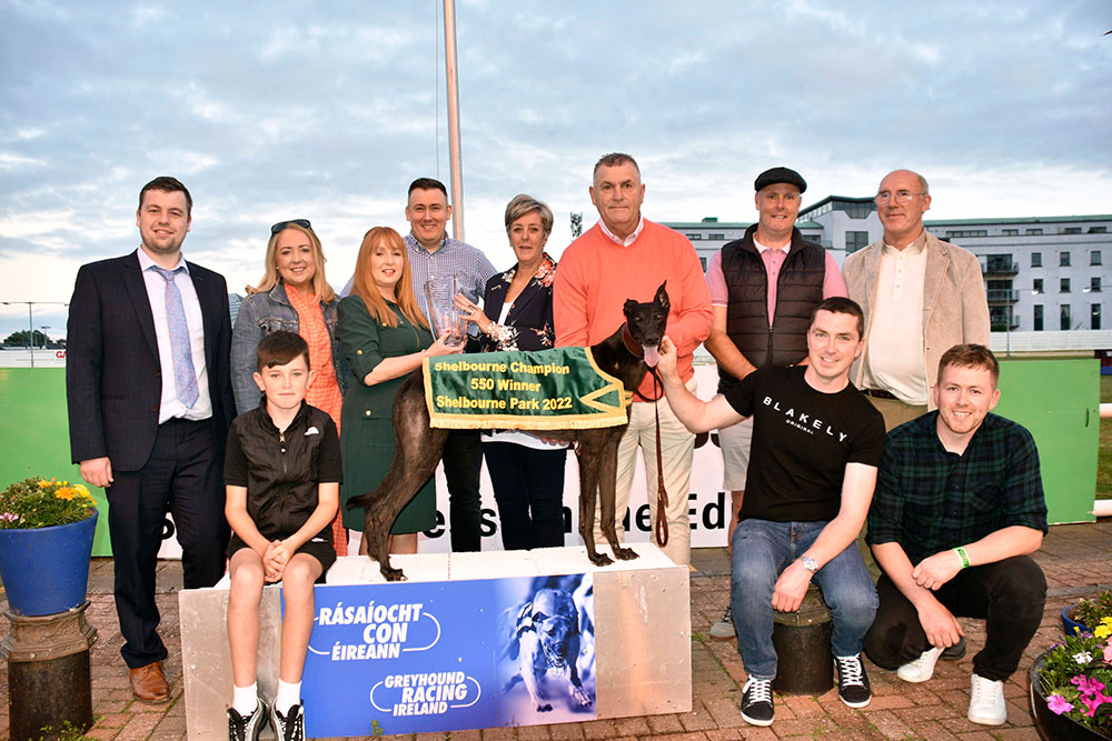 Ann Channon GRI presents the trophy to Cheryl Sutcliffe after Vincenzo won the. Shelbourne Champion 550 Final. Also included are peter Sutcliffe, trainer Pat Guilfoyle, Larry Byrne (Breeder), Gavin Byrne, Thomas O'Keeffe and Christing Cremmey. Pic: Imelda Grauer