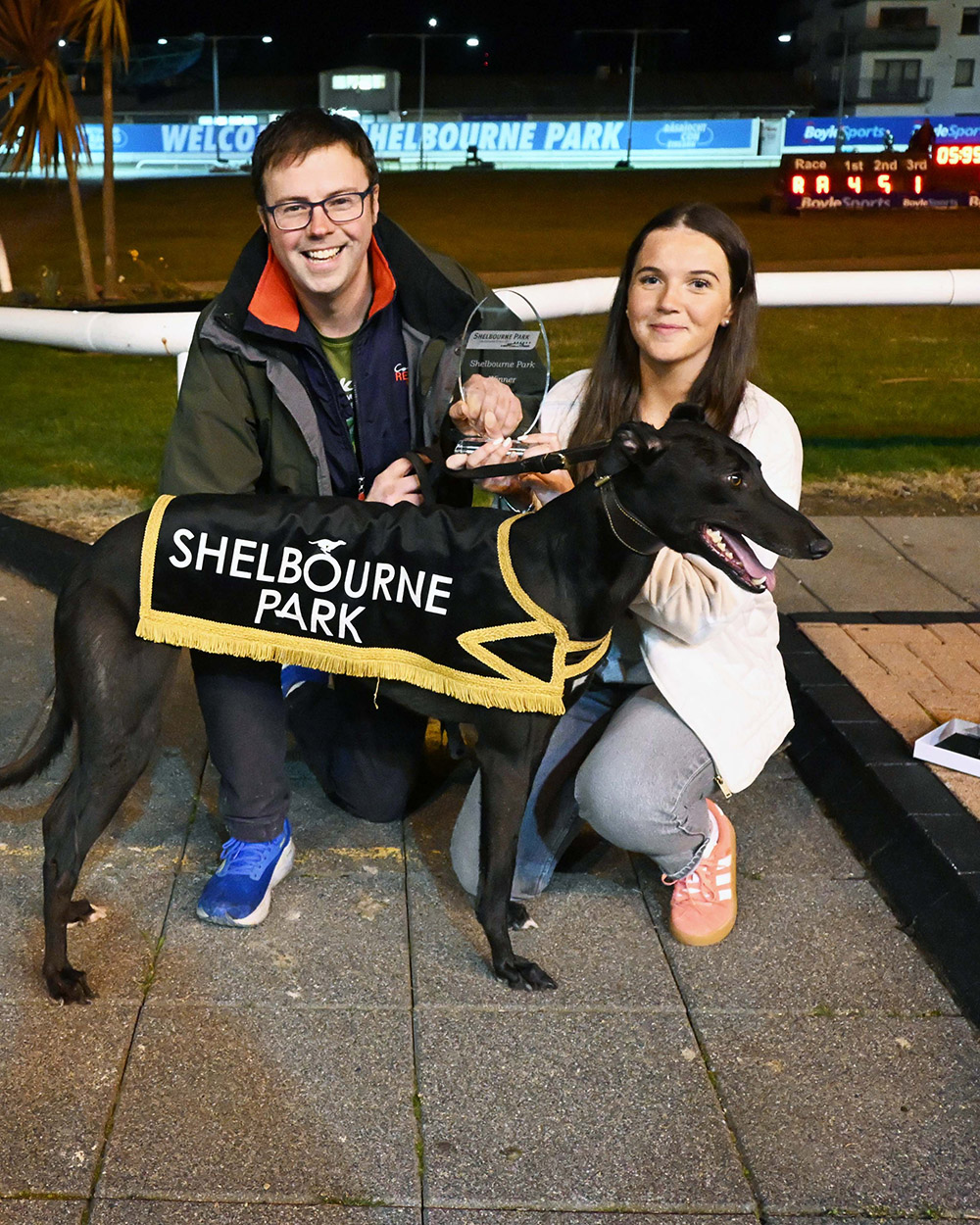 (Pic right) Abbie Donnelly presents the trophy to Francis Murray after High Performance won The Barking Buzz A1/A2 Tri Distance final at Shelbourne Park. Pic: Imelda Grauer