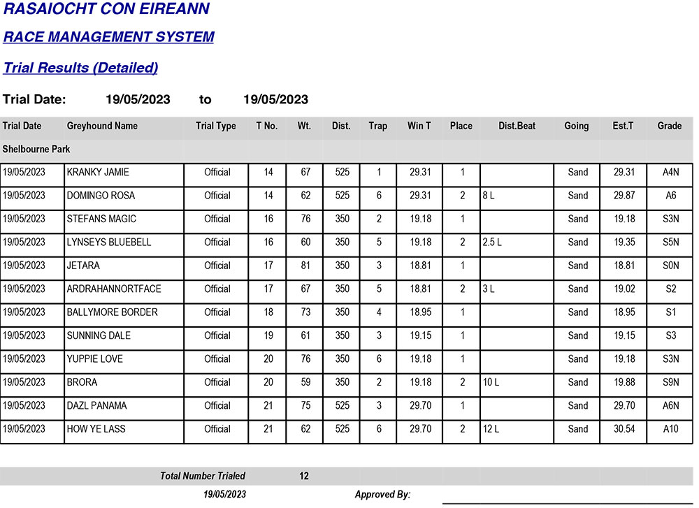 Shelbourne Park Trial Results, Friday 19/5/2023: