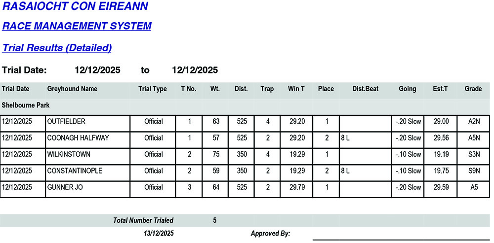 Shelbourne Park Trial Results Friday 12/12/2025: