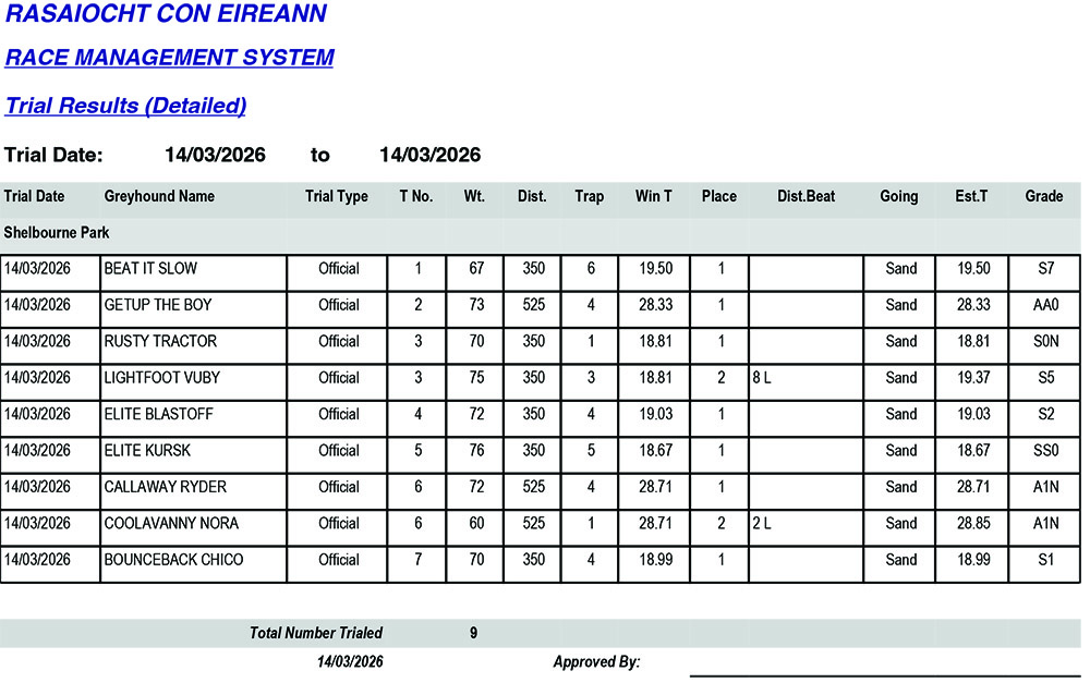 Shelbourne Park Trial Results Saturday 14/3/2026: